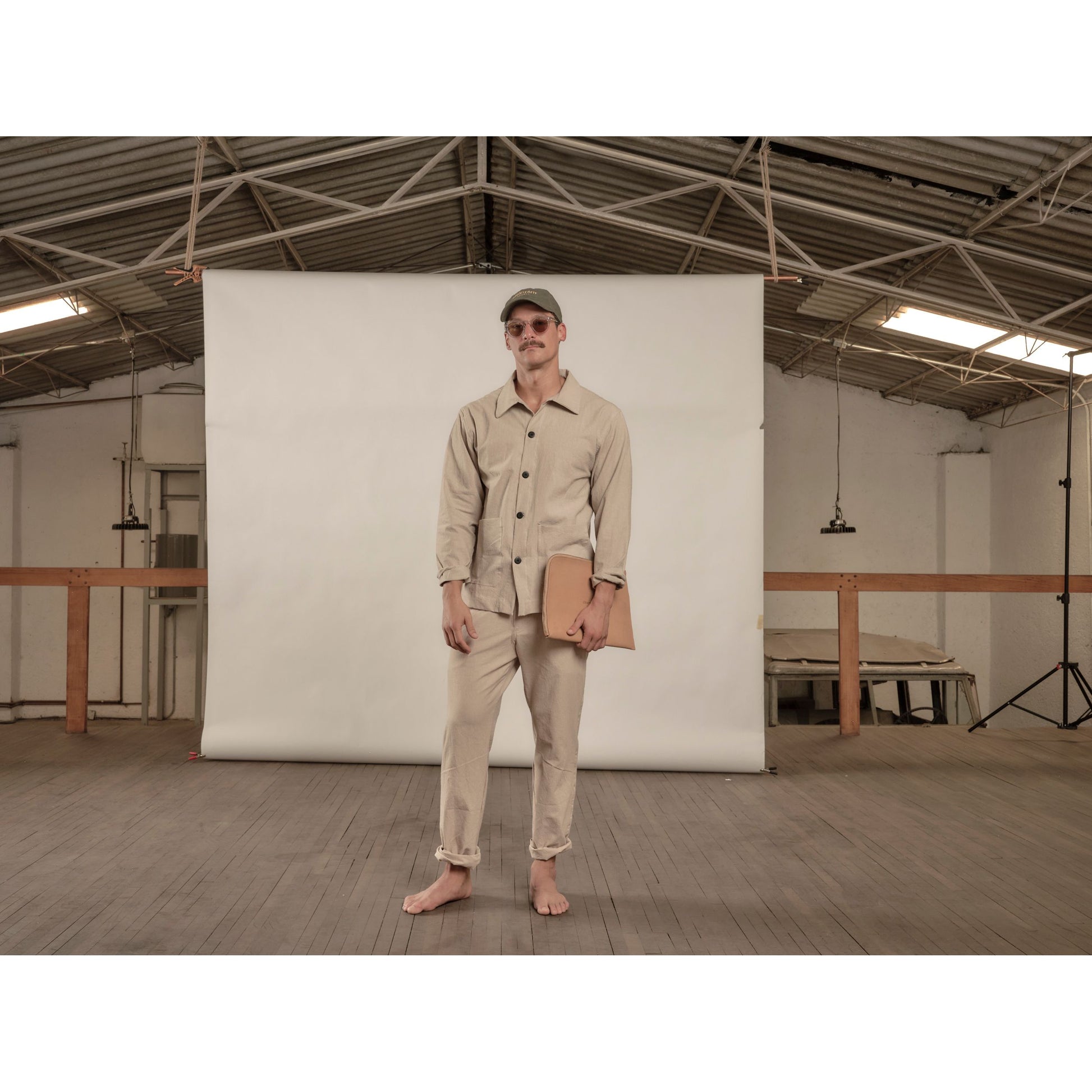 The cotton textile crafted in Puebla, Mexico, has a lightweight, dry feel that mimics the look of linen. The pre-washed fabric has a relaxed texture, making it ideal for layering or wearing solo. The workwear-inspired jacket includes two front pockets and a button fly, while the chinos boast an elastic waistband for a comfortable fit.
